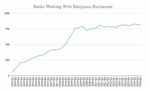 For one, it seems that the amount of banks working with marijuana businesses has plateaued since 2019. Although the number has slowly gone up, with its peak of 831 being in the second quarter of 2024. Still, the graph shows how much the banks have slowed down since 2019.
